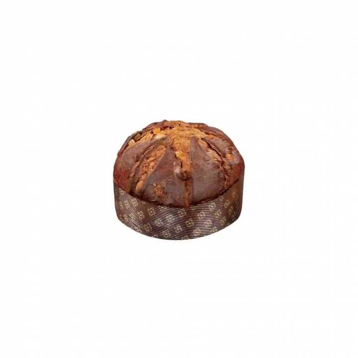 Panettone con freschi canditi d’arancia e uvetta aromatizzata al “vino Marsala DOP” e “Terre Siciliane Zibibbo liquoroso IGP”, confezionato a mano.